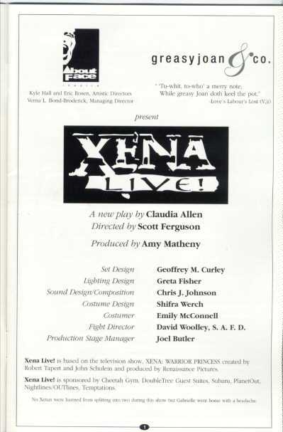 Xena Live: "Episode One Double Your Pleasure" will run from November 14 to December 29, 1999 at the About Face Theatre, Chicago, IL. For more information check out the Xena Live website at http://www.xenalive.com/index.html