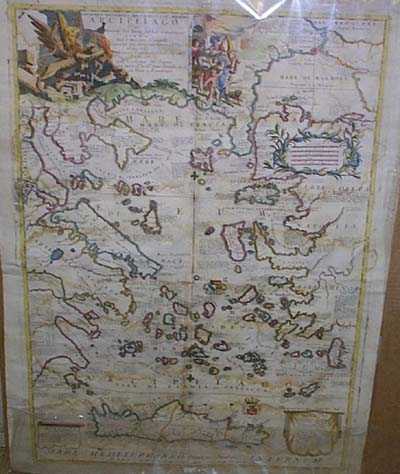 [12] CORONELLI, VICENZO MARIA. PARALELLO GEO GRAFICO DELL'ANTICO COL MODERNO ARCHIPELAGO PER ISTRUZIONE DELL'ISTORIA DELL'ISOLE CONTENUTE IN ESSO OPERA DEL P. MAESTRO CORONELLI. VENICE. 1696-7. FULL HAND COLOR. COPPER ENGRAVING. Large four sheet wall map of all the islands in the Aegean Sea. Large dramatic cartouche of a winged lion driving Turks wearing turbans from a burning building. Coronelli was a famous cartographer. He was a Franciscan Friar and appointed General of the Order in 1701. He was cosmographer to the Republic of Venice and founder of the Academia Cosmografica degli Argonauti, the world's first geographical society (1680). Historical and handsome display map. Part color, some water staining. 33.0" H. x 23.5" W. GOOD. $1,250.00 I.D.#10224