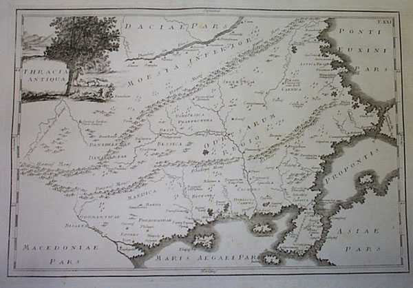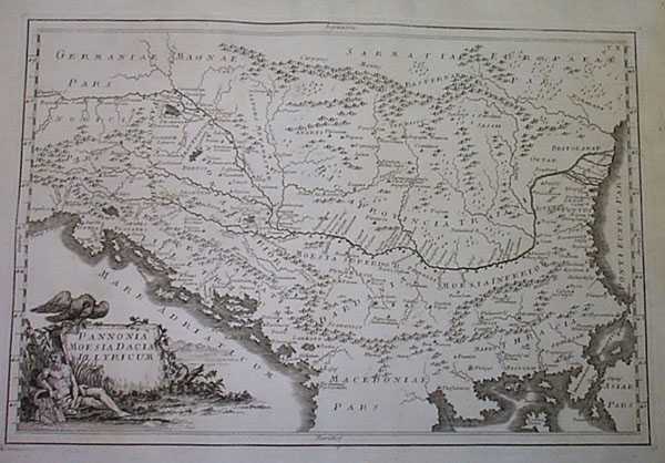 [26] CELLARIUS, CHRISTOPHORUS (1638-1707). PANNONIA MOESIA DACIA ILLYRICUM. J.B. GHISI. ROME. 1774. NO COLOR. COPPER ENGRAVING. Map of ancient European Balkans in Roman times. Plate X. The region of Xena. Washed and deacidified. A little browned. The cartographer was German, Christopher Keller (1638-1707). An authority on the ancient world, his two atlases of it went through many editions between 1686-1812. This Rome edition by Ghisi is especially handsome. Xenite scholars seeking complete atlases should search for copies on websites such as http://www.bookfinder.com. GOOD. $250.00 I.D.#23055
