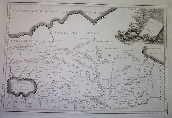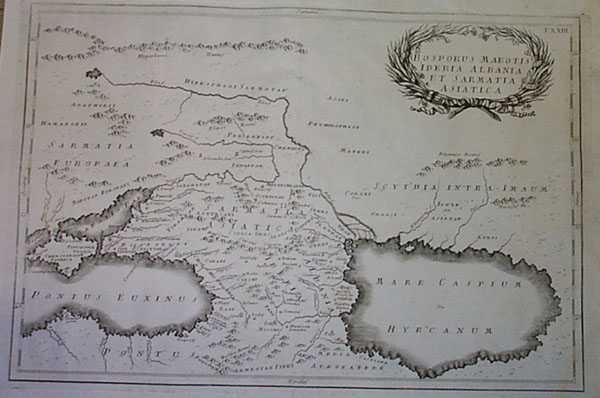 [36] CELLARIUS, CHRISTOPHORUS (1638-1707). BOSPORUS MAEOTIS IBERIA ALBANIA ET SARMATIA ASIATICA. J.B. GHISI. ROME. 1774. NO COLOR. COPPER ENGRAVING. A highly interesting map of the region between the Black and Caspian Seas in early Sarmatian times about 300 BC. Birthplace of the white race in ancient times, it is a region hard to find mapped. The Albanians and Iberians shown here, after the folk wanderings in early Christian era wound up respectively in the Balkans and Spain. Some say Xena's later children went with them founding the 'Xena Strain' in both the Balkans and Spain. To the east, north of the Caspian Sea are the warlike Scythians, much feared as the Horde. In the distance to the northwest are the Hyperborean Mountains believed in by theosophists. Hyperborea was always far away; vague in location; in later Sarmatian times it was the northern Baltic States region. Plate XXIII Washed and deacidified. Lower margin soiled 12.0"H. x 17.75"W. GOOD. $400.00 I.D.#23070