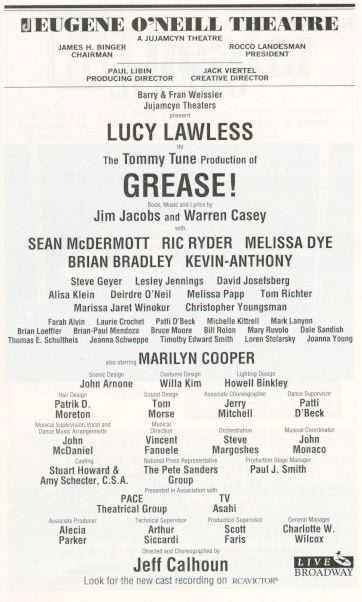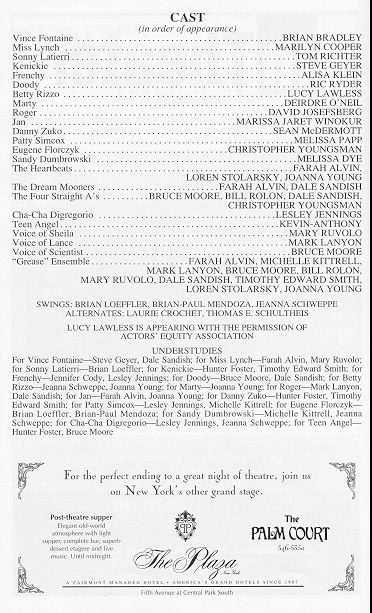 [08] Now for what we all waiting for: her singing! It seems so inadequate to say she was "great" or "awesome", but that is the best way to describe it! Lucy has a beautiful voice. It was clear and on-key. While maybe it was not as "big" as some of the other women in the show, who tended to sound a little strained at times, all we can say is, "It was the first night!" In a few days she will be belting it out even better than her great-sounding opener. She can sing the sassy, funny songs with the whole gang and have a great time, but her big solo moment was near the end of the show with a slow, introspective Rizzo song. Here, without the orchestration and the rest of the cast, we get a glimpse of the real power of her voice that we would love to hear a lot more of.[09] At the end of the show, following a huge standing ovation, the cast acknowledged her on her opening night and Lucy took a few minutes to speak to the audience. She said performing on Broadway was truly a dream come true for her, and she was extremely grateful for the support of the fans. This was shown on Entertainment Tonight. We were thrilled for Lucy because she was able to realize one of her lifelong dreams, something not many of us get a chance to do. She looked like she was thoroughly enjoying herself, and it was great to see her so happy, on Cloud Nine no less!! We are so glad we went and would go again in a minute.